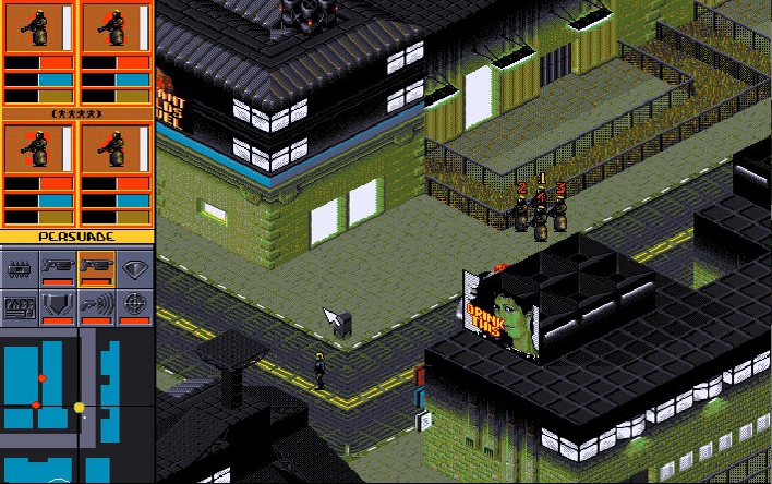 “The game puts the player in charge of a self-named corporation in a gritty near-future cyberpunk-style world. Up to four cyborg agents are sent on a series of deadly missions, which include assassinations, infiltration, theft and persuasion (using a device called a ‘persuadertron’ to capture individuals of importance — scientists, for example). The game’s objective is to establish world-wide dominance with the established syndicate, one territory at a time, while engaging and eliminating rival syndicates.”