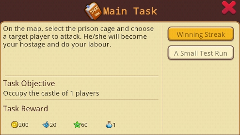 The task menu is where most of the story-based and quest missions will be. They include building certain target amounts of resources, helping friends, stealing from friends, winning battles, building kingdom buildings, and plenty of other similar tasks.