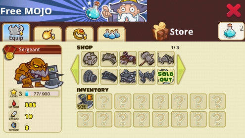 This is where you can buy weapons, items and MOJO for your hero and kingdom. You can also equip items and magic on your hero or sell unwanted items.