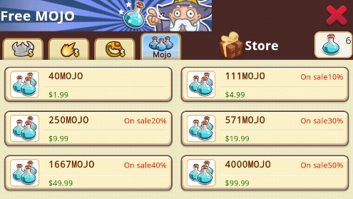 Most things can be purchased with coins or crystals, and many things will require a combination of the two. However, you have the option to buy (with real money) MOJO, which appears to some type of magical potion. MOJO will allow you speed up the time it takes to harvest resources and will also allow you to purchase upgrades for your hero like weapons, spells, and armor. You will receive some free MOJO when you complete missions, level up and do various other tasks but it won’t usualy be enough buy items in the store straight away.