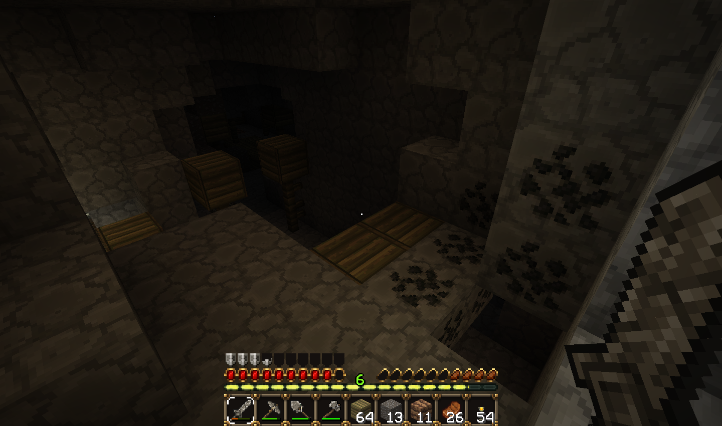 I respawn back to my foreman shack. It takes a while but I manage to run back to where i died and pick up my loot and equipment. I decide to go back to the zombie dungeon where the Zombie House Mafia have only left a few of their groupies behind. I take them out easily and triumphantly loot the two chests in the dungeon. The chests this time don’t contain anything that exciting (saddles etc). While I am there I mine the mossy cobblestone which could be useful for decorations later on.