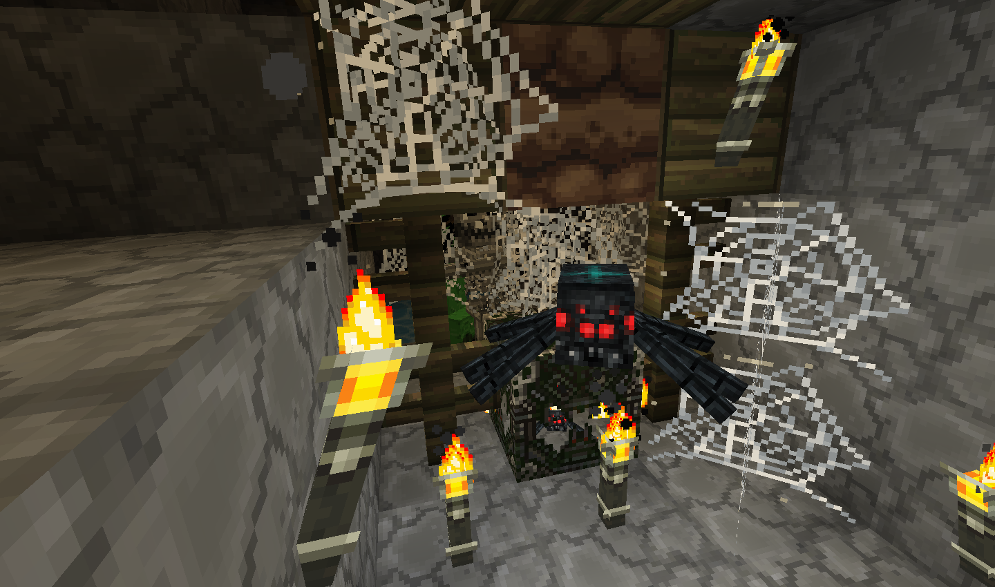 I find a mine type spider dungeon filled with cobwebs, spiders, Creepers and skeleton archers waiting to send me back to respawn. I tango with the fellas and after while manage to kill all them without too much injury. I destroy the monster spawner but don’t find any chests nearby which is disappointing.