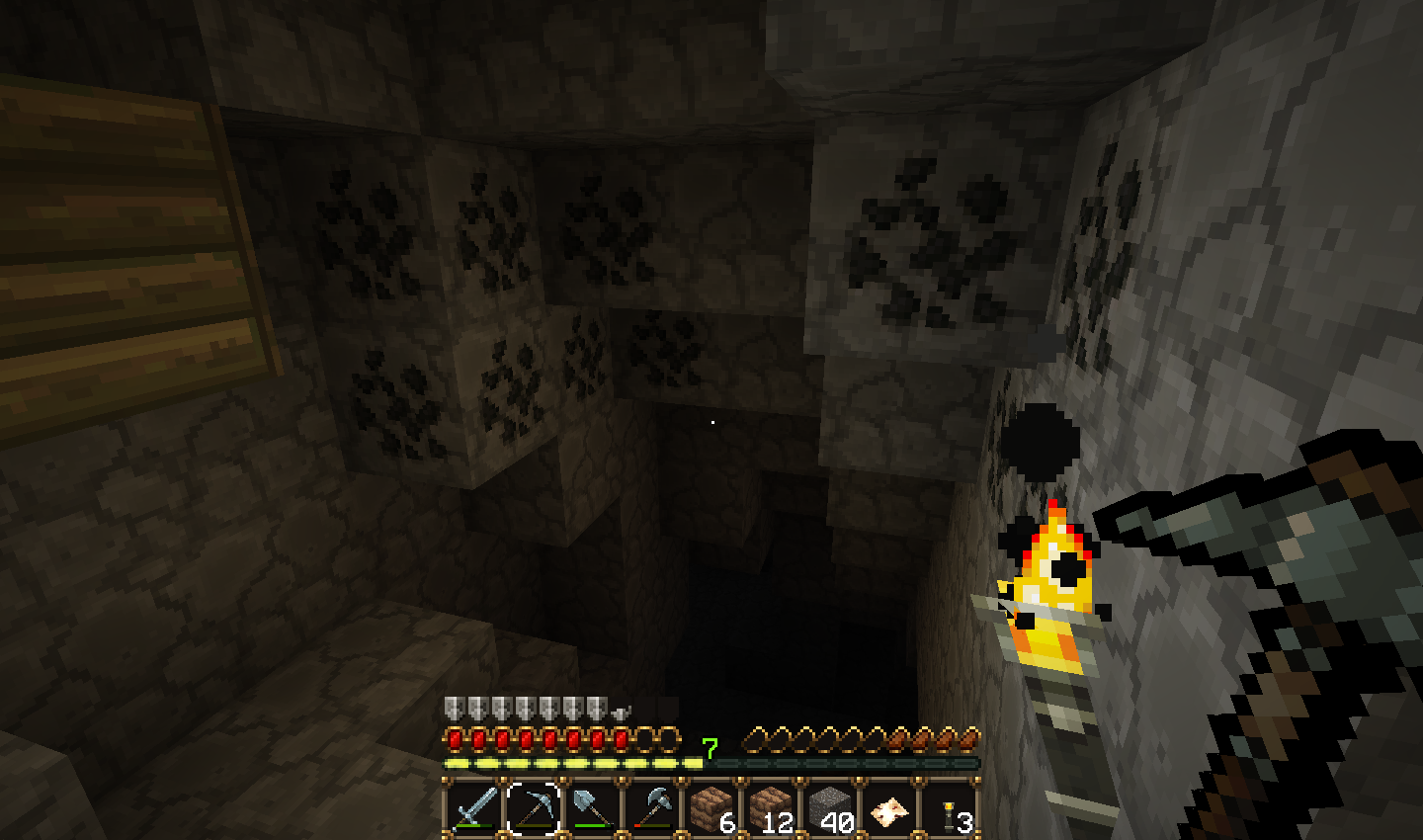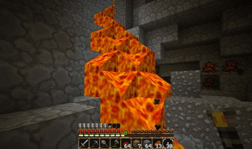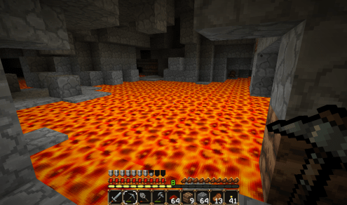I decide to leave the mines and start digging down with my own tunnels and not before too long I come across open areas filled with lava pools and plenty of materials such as Redstone and iron.