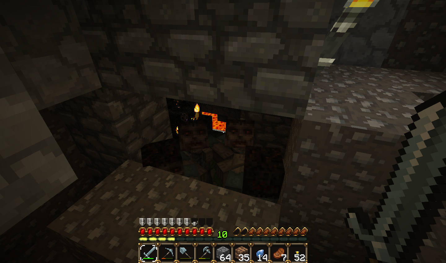 I continue my journey through the caverns I just found and a little while later I find a dungeon filled with zombies and lava. The place is literally jumping they must be playing some banging tunes. I decide to join them. Oh yeah they are the Zombie House Mafia (see what I did there).