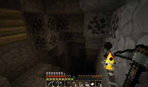 I find some pre-existing mines underground when I enter one of the cavers nearby my fort. I decide to follow it a bit and find a few treasure chests, wood, some mine tracks which I don’t take but take a note of their position for when ever I start my mine cart network. I also find plenty of cobwebs that are really annoying and spiders that want to give me plenty of kisses. I dispatch them after not too much trouble with my iron sword.