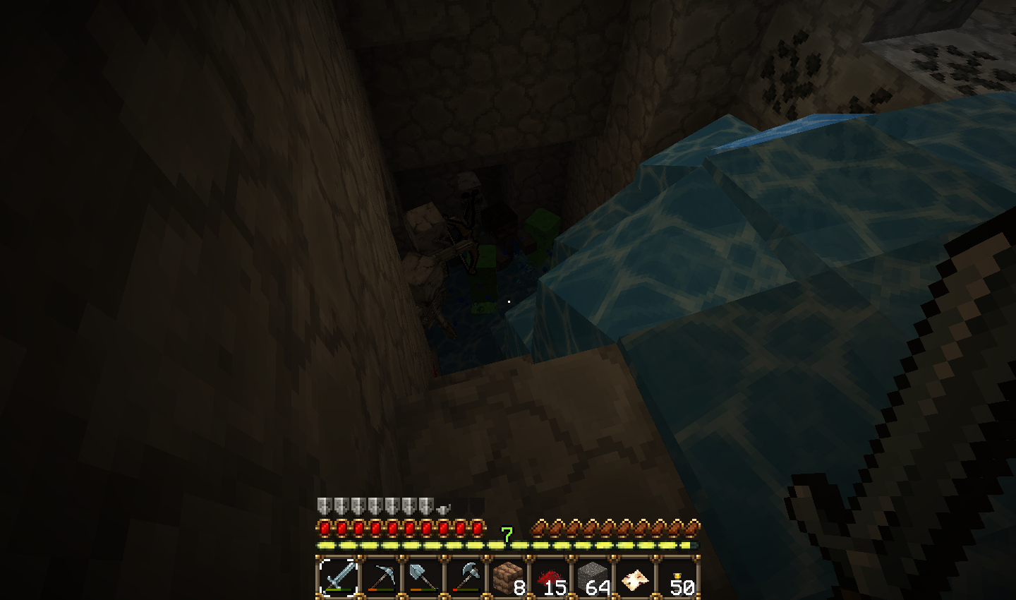 I come across a river which leads to a more open area below. To my surprise it’s filled with skeletons, Creepers and a single zombie. It look like some sort of gang war between the Skeleton Mafia and the Creeper Mafia with a zombie caught in the middle. I decide that the reward of helping isn’t worth the risk of biting the dust again so I leave the monsters to their petty war.