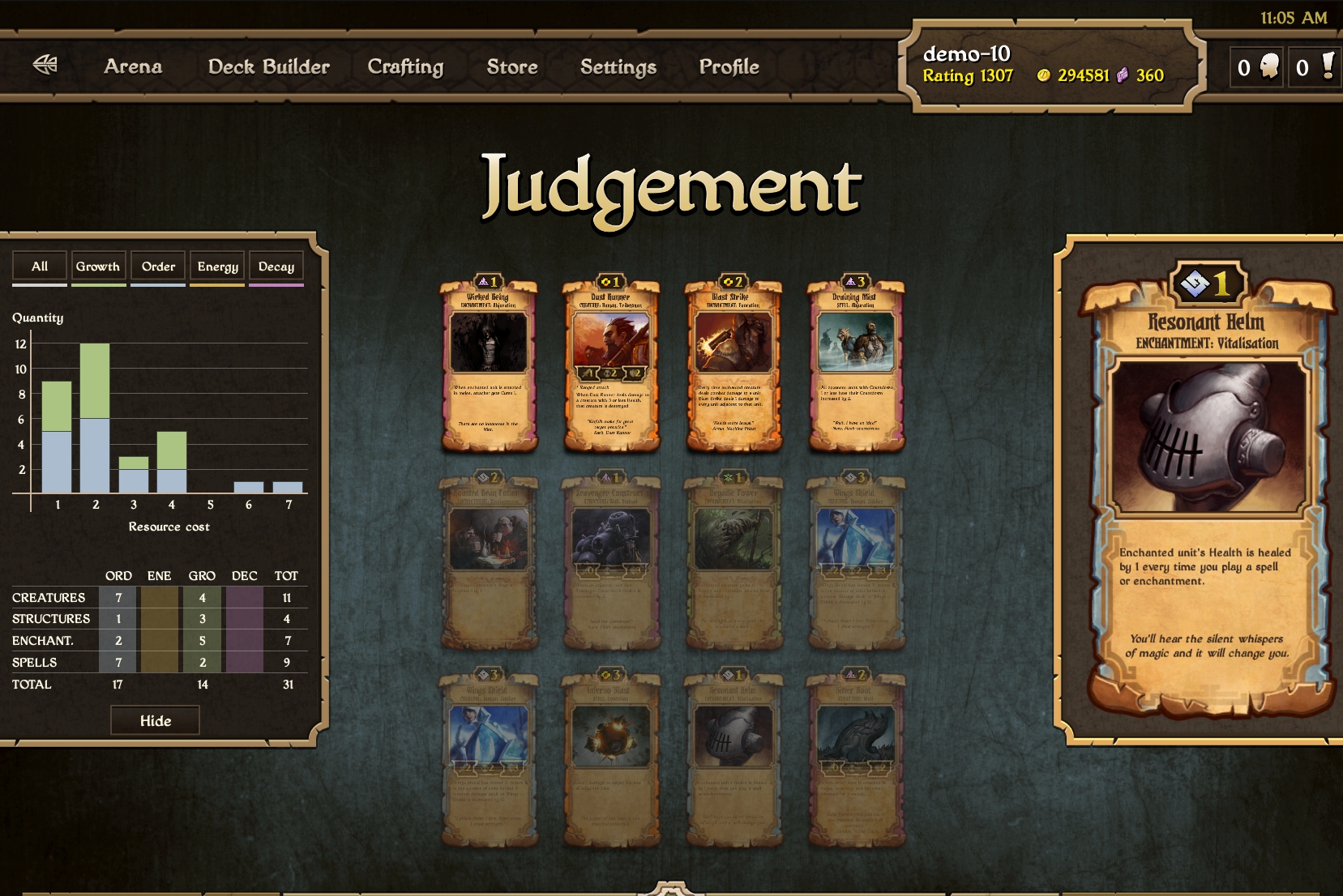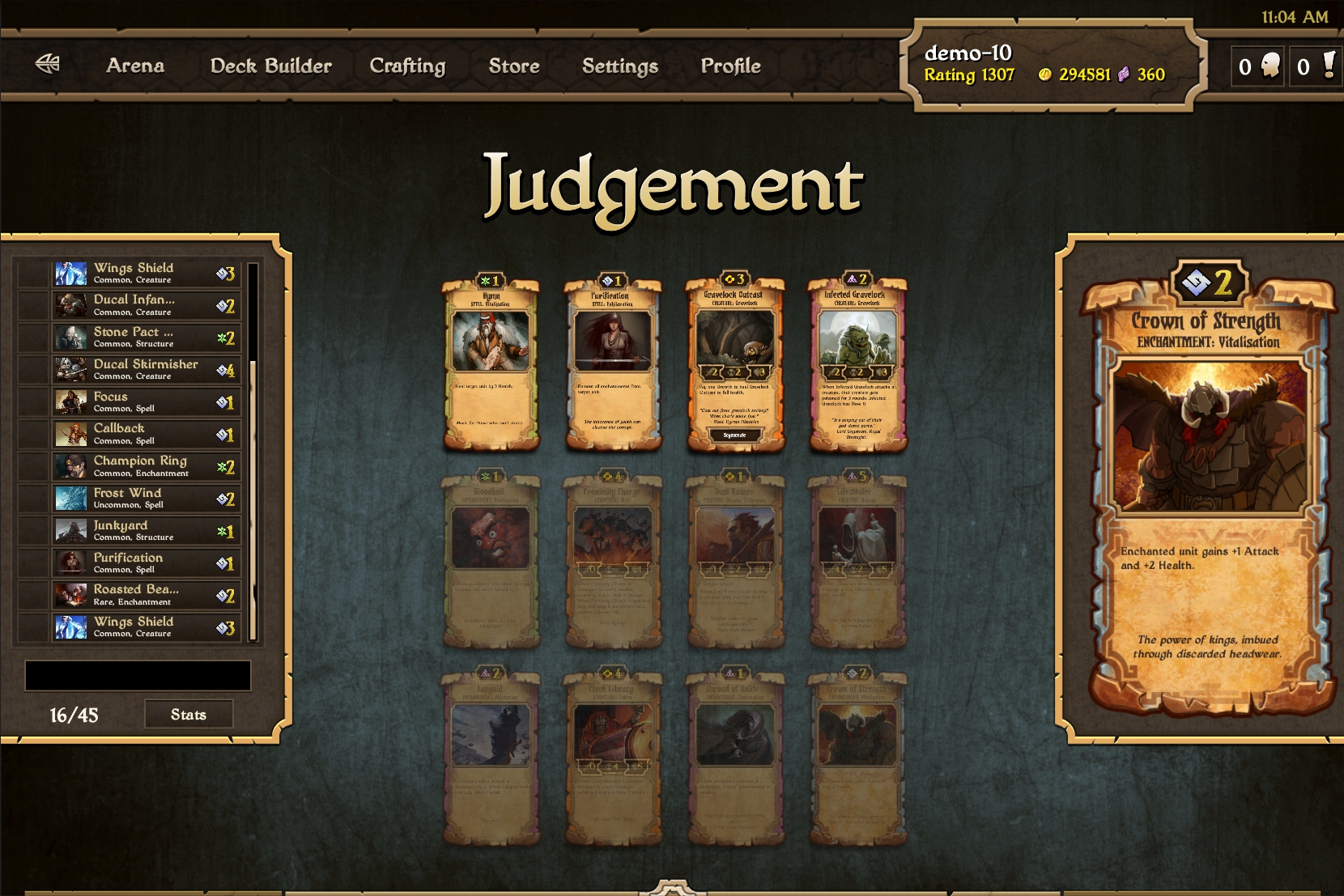 In Judgement mode you don’t use your current collection of scrolls in matches. Instead, you create a brand new deck from a random selection of Scrolls. Four scrolls can be selected until you have a total of 45 scrolls, before you can use a deck using at least 30. This deck will last for five competitive matches. At the end you will get rewarded depending on how well you do. Again similar to Arena mode in Hearthstone. You can enter Judgement mode with Shards or Gold but expect to either have a lot of Gold or be prepared to pay for some Shards.