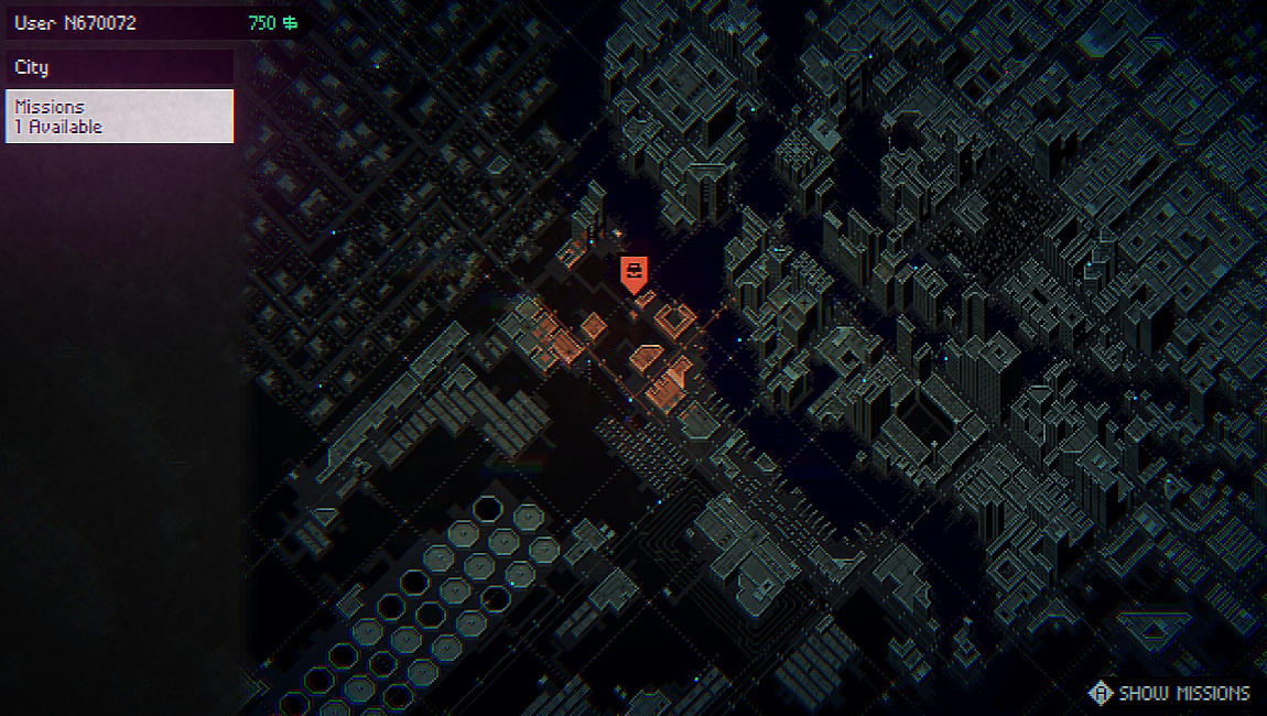 The game has a simple and satisfying loop. You start on the world map, an overhead map of the city. Here you can visit shops and select a mission (drop) to complete. Once done, you return back to the map.