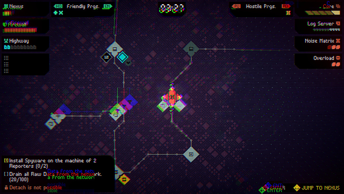 In a drop, I would start by running my repair program, connecting some nodes to find a log node to run the log-deleting program. Then I would concentrate on the objective and download data as I go. The game is very active. Other hacking games often feel more relaxed and leisurely.