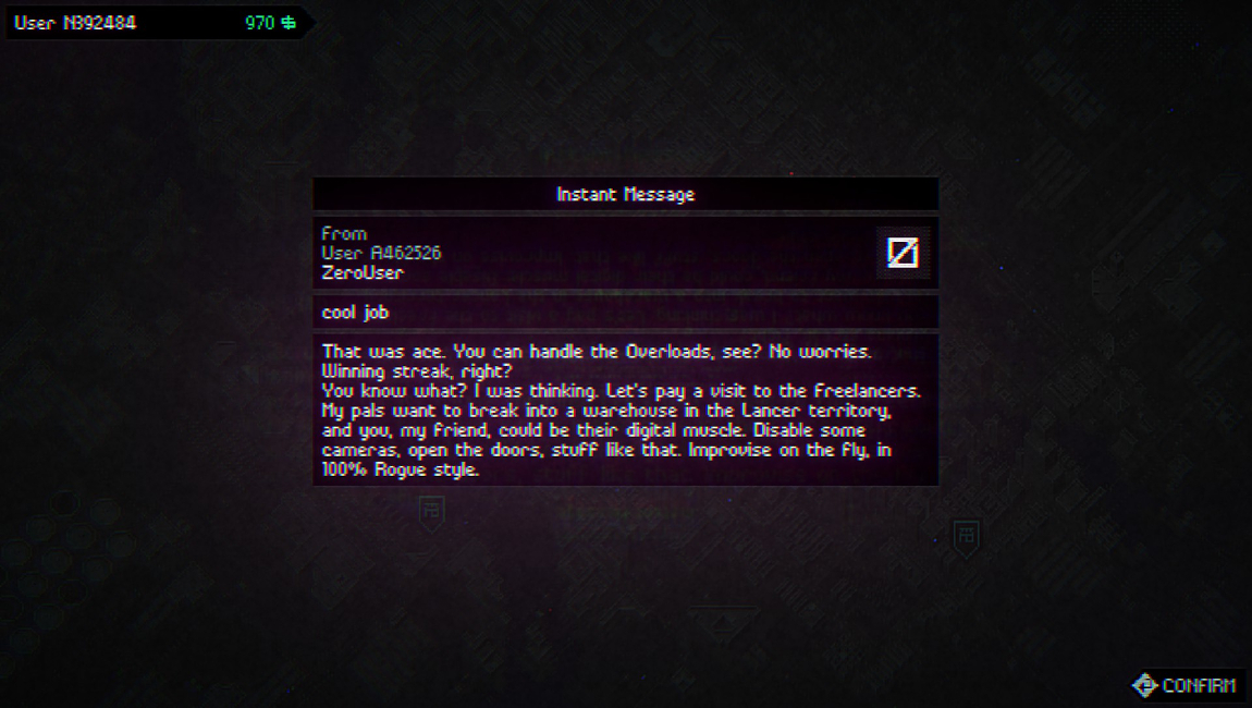 The shops unlock as you progress. One allows you to purchase upgrades to your deck, such as better firewalls, faster hacking speeds, and more threads. While the other shop lets you buy a selection of software packages to help in a drop. These range from programs that automatically repair your firewall and delete logs to programs that bust gates and locks.