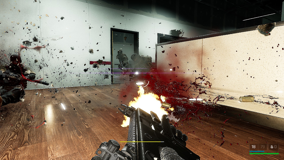 The visuals in Trepang2 are often impressive and usually rough. When shooting up a corporation complex, you are reminded of The Matrix. Windows smashing and walls cracking, while decals, bodies, and guns litter the place. Suddenly you are reminded of the budget nature of the game when a lot of the scenery can’t be damaged, and objects don’t have physics. The world regularly feels rigid and locked down, with glue adding to the low-quality feeling.