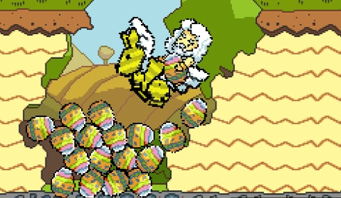 God riding he's Big Yellow Striped Winged Bunny which he uses to steal eggs.